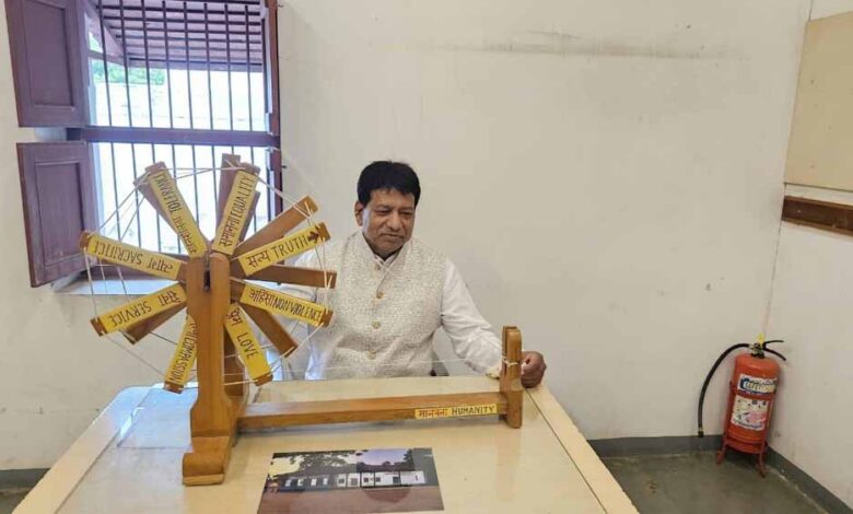 विधायक गोपालसिंह इंजीनियर ने साबरमती आश्रम में चरखा चलाया,आश्रम में स्थापित महात्मा गांधी की प्रतिमा पर सूत की माला पहना कर बापू को नमन किया ।
