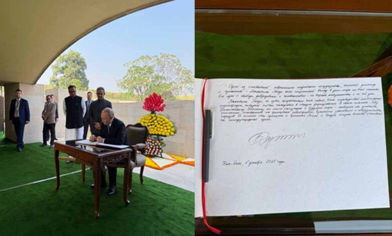 रूस के राष्ट्रपति व्लादिमीर पुतिन ने शुक्रवार को राजघाट पर महात्मा गांधी को श्रद्धांजलि दी। इसके बाद रूसी राष्ट्रपति ने एक विजिटर बुक पर हस्ताक्षर भी किया, जिस पर एक संदेश लिखा था। महात्मा गांधी के लिए दिए संदेश में पुतिन ने लिखा कि आधुनिक भारत के संस्थापकों में से एक के रूप में उन्होंने विश्व शांति के लिए अमूल्य योगदान दिया। राजघाट परिसर के सम्मानीय विजिटर्स की बुक पर हस्ताक्षर करते हुए, पुतिन ने कहा कि महात्मा गांधी ने नए, ज्यादा न्यायपूर्ण, बहुध्रुवीय विश्व व्यवस्था का अंदाजा लगाया था जो अभी अपने शुरुआती दौर में है।
