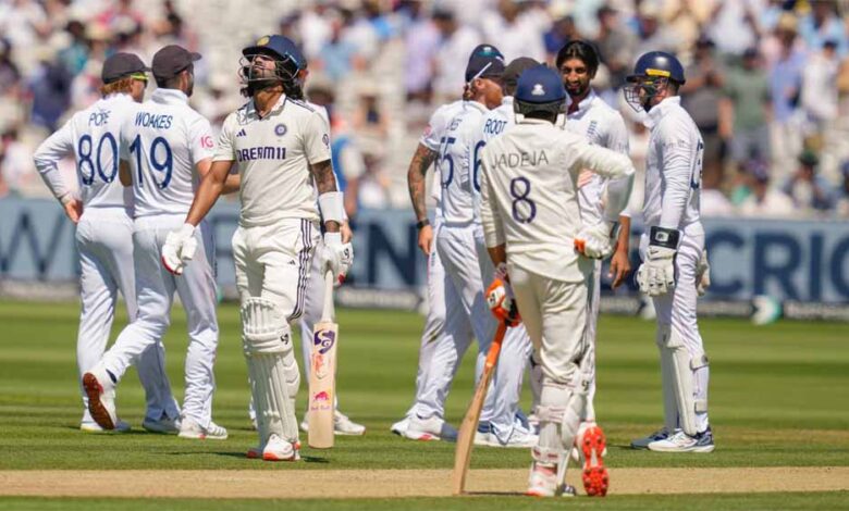 भारत और इंग्लैंड के बीच पांच मैचों की टेस्ट सीरीज का तीसरा मैच लॉर्ड्स क्रिकेट ग्राउंड पर खेला जा रहा है। इंग्लैंड ने पहले बल्लेबाजी करते हुए 387 रन बनाए, इसके जवाब में भारत ने पहली पारी में पांच विकेट गंवा दिए हैं। ऋषभ पंत 112 गेंद में 74 रन बनाकर रन आउट हुए। राहुल और पंत के बीच चौथे विकेट के लिए 198 गेंद में 141 रन की साझेदारी हुई। केएल राहुल 100 रन बनाकर शोएब बशीर का शिकार हुए। तीसरे दिन टी ब्रेक तक नीतीश रेड्डी (25) और रविंद्र जडेजा (40) क्रीज पर मौजूद हैं।