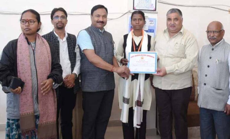 पर्यटन मंत्री  राजेश अग्रवाल ने हैमर थ्रो में राज्य स्तर पर तृतीय स्थान प्राप्त करने वाली छात्रा सुधा सिंह को किया सम्मानित