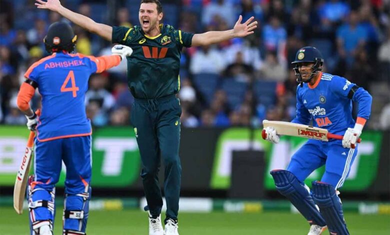इससे पहले खचाखच भरे एमसीजी मैदान पर भारतीय कप्तान सूर्यकुमार यादव टॉस हार गए। इसके बाद हेजलवुड ने अपनी गेंदों से कहर बरपाया लेकिन फॉर्म में चल रहे अभिषेक एक छोर पर डटे रहे। हेजलवुड ने अपने चार ओवर के स्पेल में 15 डॉट गेंदें फेंकी। उन्हें पिच से अच्छा मूवमेंट मिल रहा था जिससे भारतीय शीर्ष क्रम उलझन में पड़ गया। उन्होंने शुभमन गिल (05) को बाउंसर फेंकी जो उनके सिर पर लगी जिसके लिए अनिवार्य कनकशन जांच करनी पड़ी। इससे पहले गिल उनकी अंदर आती फुल लेंथ गेंद पर पगबाधा की अपील से बचे थे।